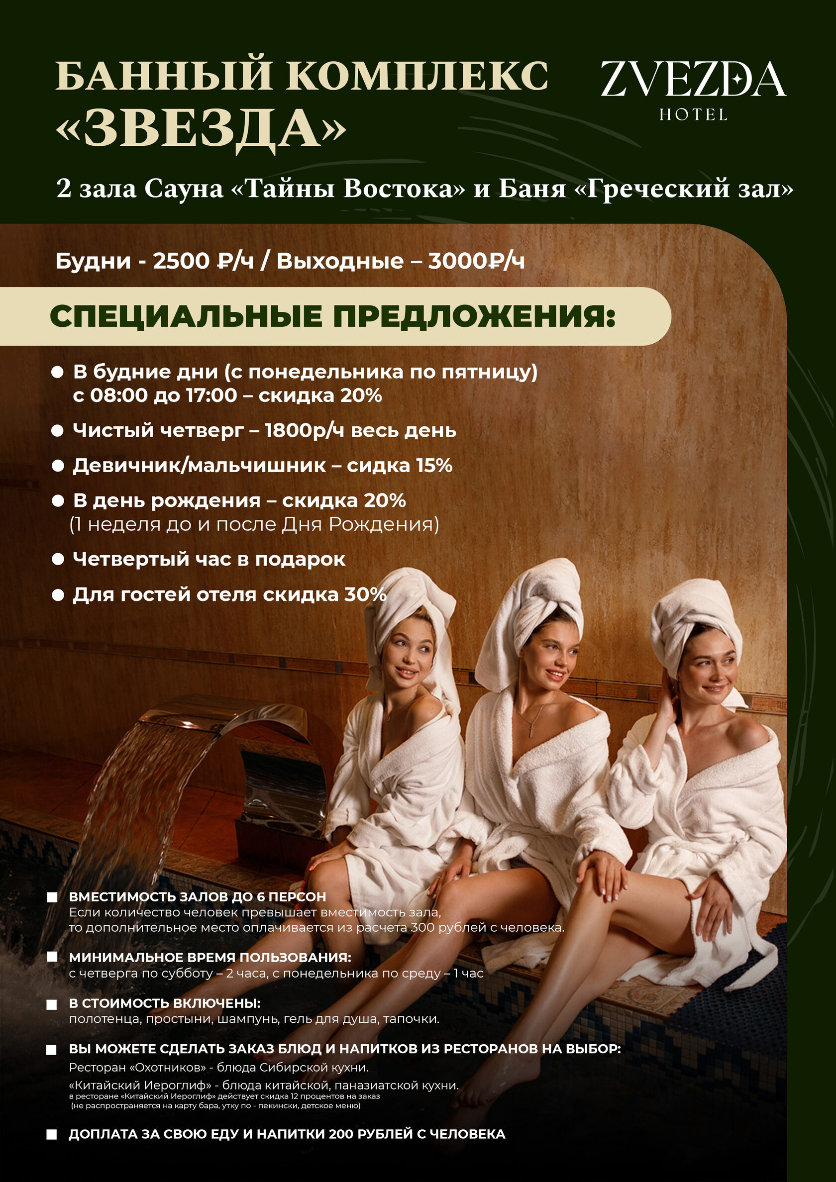 * Вы можете сделать заказ блюд и напитков из ресторанов на выбор: Ресторан «Охотников» - блюда Сибирской кухни / ресторан «Иероглиф» - блюда китайской, паназиатской кухни.В ресторане «Иероглиф» действует скидка -12% на заказ (не распространяется на карту бара, утку по - пекински, детское меню).